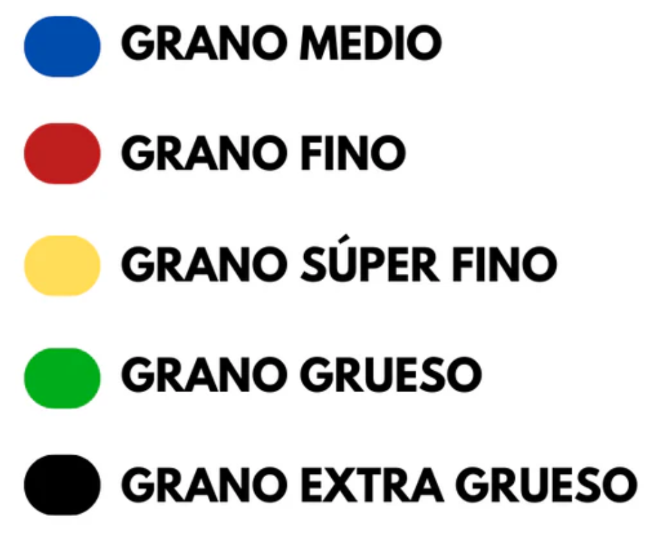 | Grano | Medio, Fino, Súper Fino, Grueso, Extra Grueso |